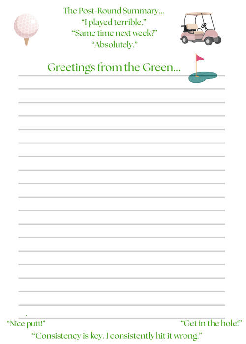 Bring personality and purpose to the course with Greetings from the Green, a 50 page stylish notepad designed especially for women golfers who love the game and the lifestyle that comes with it. Whether you’re tracking scores, jotting down swing thoughts, planning tee times, or leaving notes for your foursome, this pad blends functionality with golf-inspired charm.